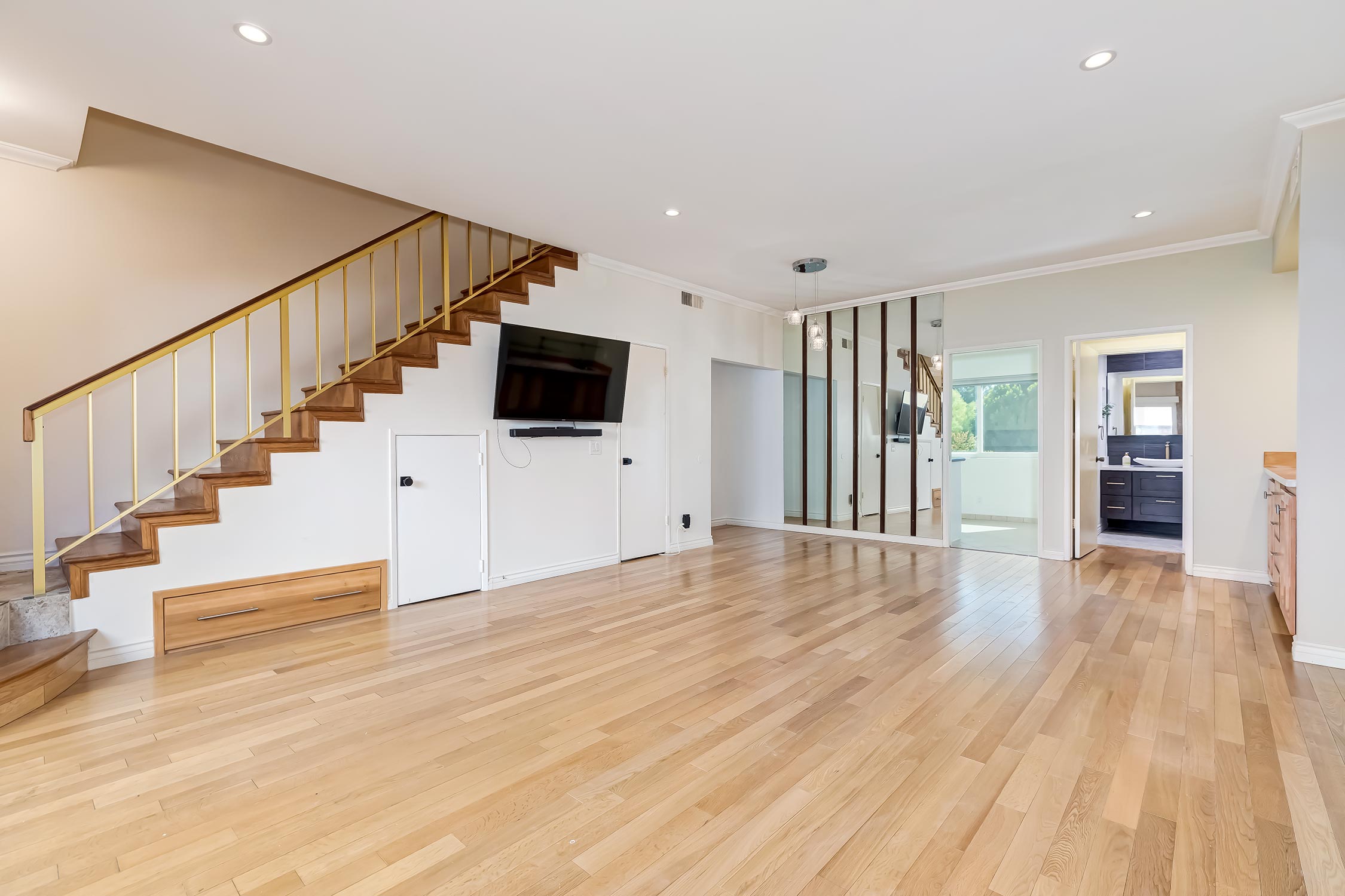 This 2-story front-facing townhouse features 2 bedrooms and 3 bathrooms and is located in prime Encino. As you enter, you are welcomed by the open living room with high ceilings, recessed lighting, a wet bar, a cozy stone gas fireplace, and a private outdoor patio--perfect for entertaining! Try out new recipes in your fully outfitted kitchen while enjoying the view out the window. There is also a remodeled powder room and a stackable washer and dryer for your convenience. Upstairs leads you to the master suite and guest bedroom. As you enter your large primary bedroom, you will find ample closet space and a gorgeous ensuite master bathroom with a luxurious spa-like shower and soak-in tub. Down the hall you will find the guest bedroom with a walk-in closet and an ensuite bathroom. Additional features include hardwood floors throughout and central AC and heat controlled by a Nest system. The building amenities include an outdoor pool and spa, fitness room, recreation room, secured subterranean garage with storage, and 2-car tandem parking. Conveniently located near Ventura Blvd's shops, restaurants, and parks.